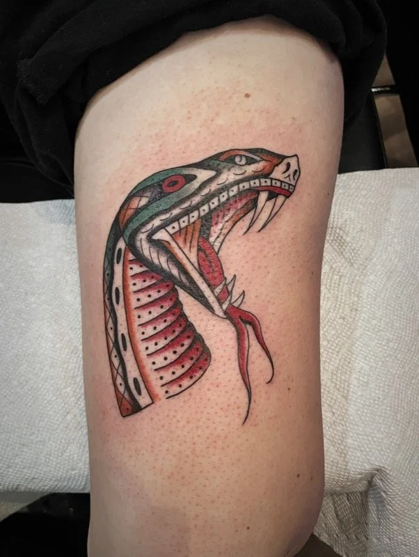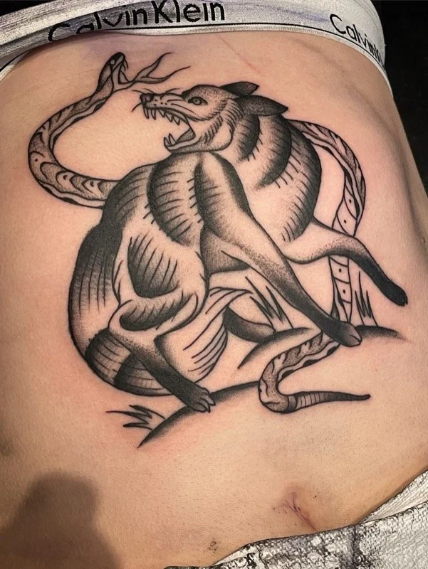Nate Kemr specializes in black & color traditional, wild style, blackwork, botanical, etchings, and fineline. Contact Nate for booking via his email.